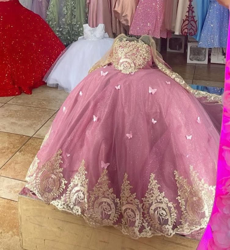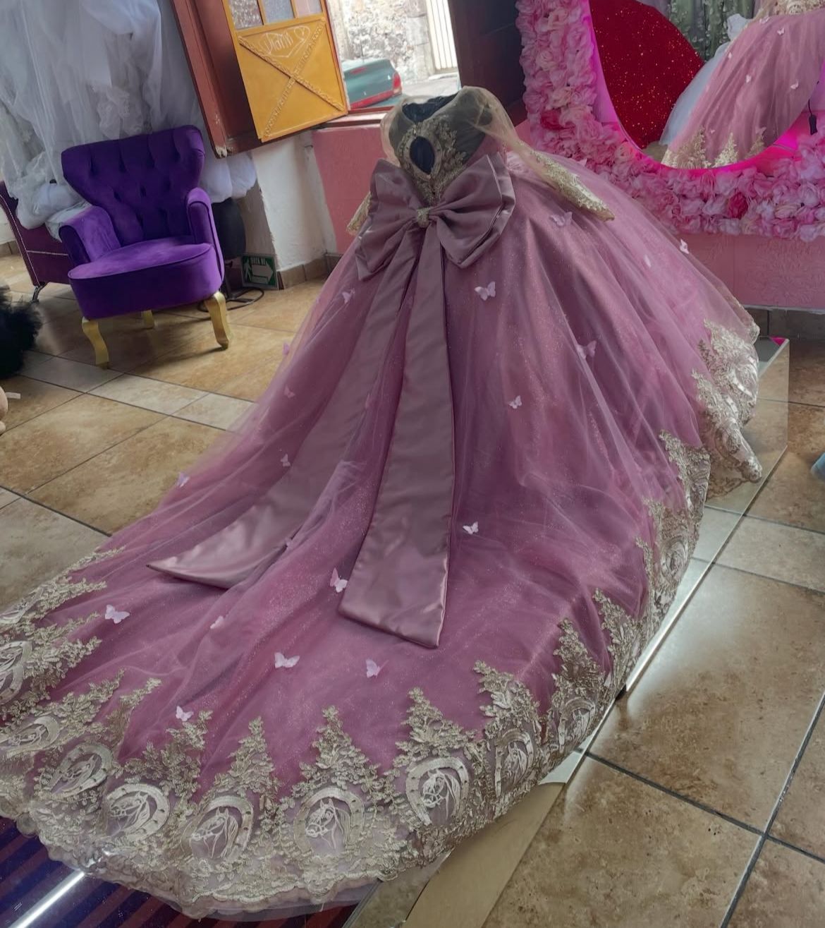 Descripción: Vestido charro con cauda, una pieza, manga 3/4, con transparencia, moño atrás.