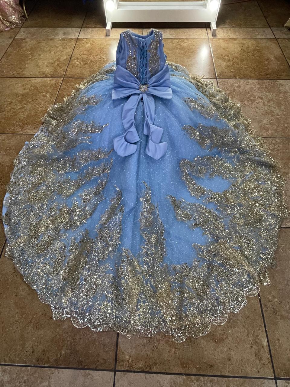 Este vestido para niñas, uno de los más vendidos, es una verdadera pieza de impacto que hará lucir a las pequeñas en cualquier ocasión especial. Su diseño elegante se destaca por una hermosa aplicación dorada que realza todo el vestido, aportándole un toque de sofisticación y brillo. La cauda larga y delicada añade un aire de glamour, mientras que el moño con escarola en la parte de atrás le da un toque adorable y único. Seguro será la opción favorita para que las pequeñas se sientan como princesas!