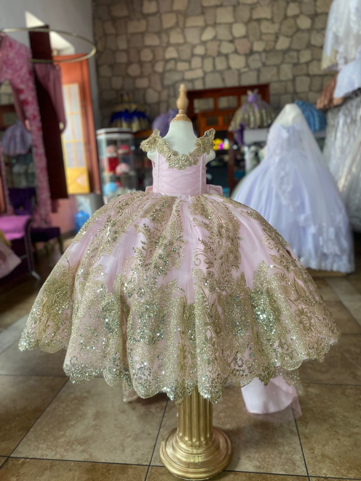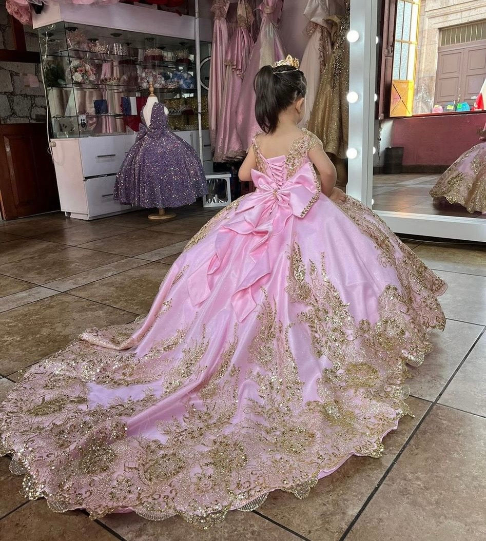 Uno de los modelos más vendidos, es una verdadera pieza de impacto que hará lucir a las pequeñas en cualquier ocasión especial. Su diseño elegante se destaca por una hermosa aplicación dorada que realza todo el vestido, aportándole un toque de sofisticación y brillo. Es desmontable con una falda corta dándole un toque coqueto al vestido. La cauda larga y delicada añade un aire de glamour, mientras que el moño con escarola en la parte de atrás le da un toque adorable y único. Seguro será la opción favorita para que las pequeñas se sientan como princesas!
